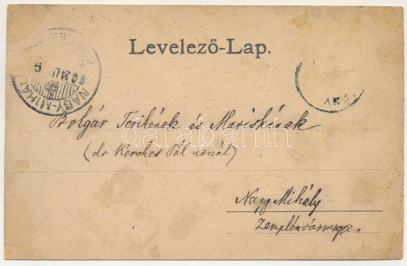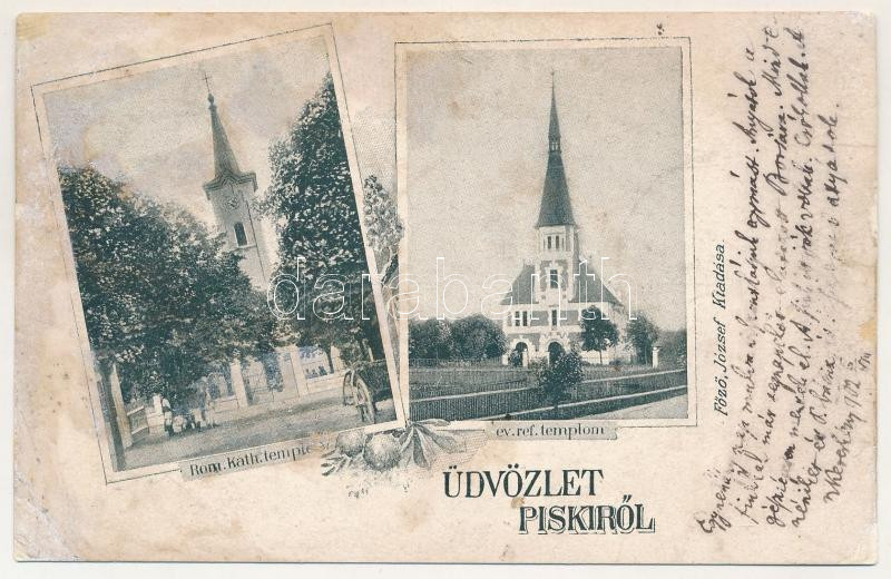 1902 Piski, Simeria; Római katolikus templom, Református templom. Főző József kiadása / inn, bridge, school. Art Nouveau, floral (r)