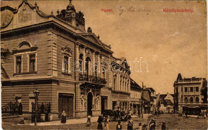 1909 Kézdivásárhely, Targu Secuiesc; Vigadó, piac. Turóczi István kiadása / restaurant, market + "KÉZDI-VÁSÁRHELY - BRASSÓ 172. SZ." vasúti mozgóposta bélyegző (r)