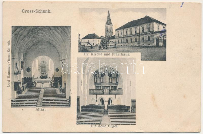 1909 Nagysink, Gross-Schenk, Cincul Mare, Cincu; Ev. Kirche und Pfarrhaus, Altar, die neue Orgel. Josef Hammer / evangélikus templom és parókia, oltár, orgona, belső / Lutheran church, parish, new organ, altair, interior (fl)