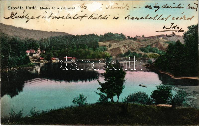 1911 Szováta, Sovata; Medve-tó a kilátóval. Dragomán S. J. kiadása / Lacul Ursu / lake with lookout tower (ragasztónyom / glue marks)
