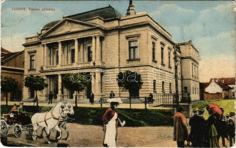1912 Lugos, Lugoj; Városi színház, montázs hintóval. Auspitz Adolf kiadása / theatre, montage with horse-drawn carriage (Rb)