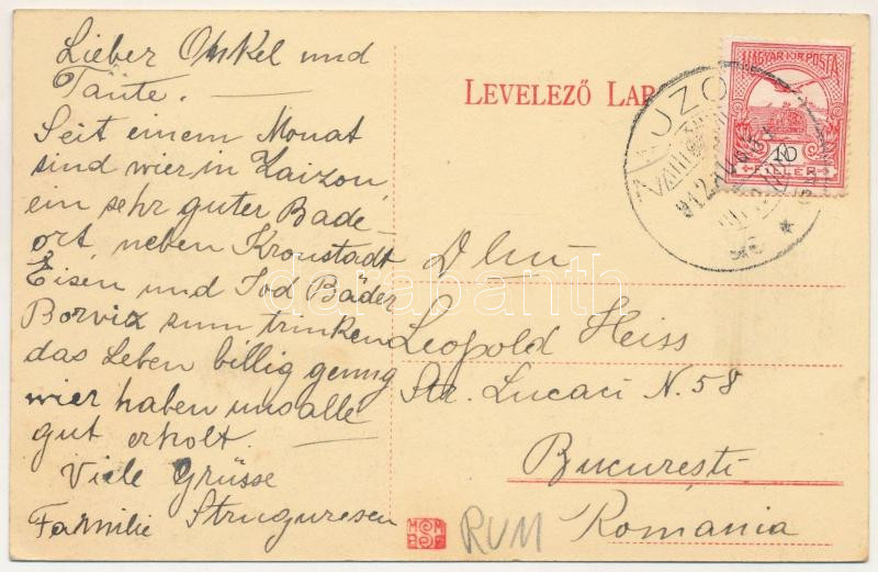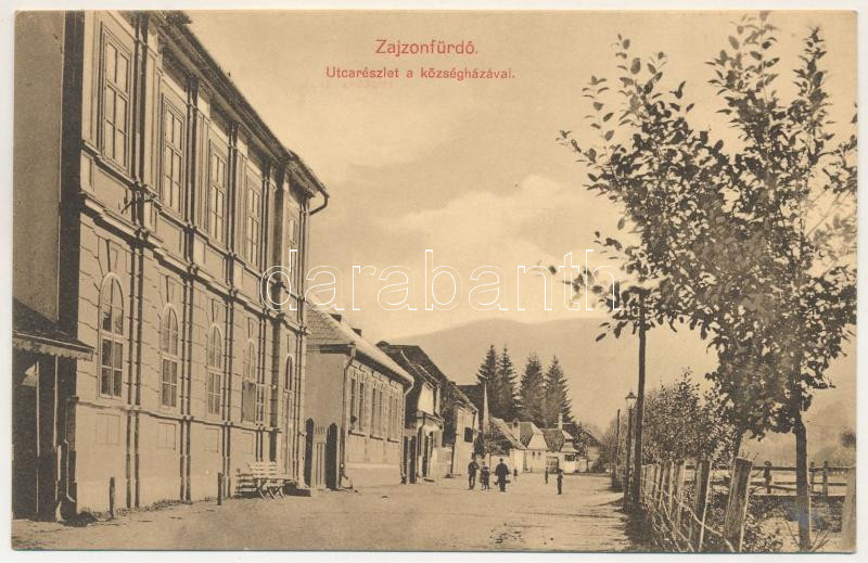 1912 Zajzon, Zaizon-fürdő, Zajzonfürdő, Baile Zizin; utca részlet a községházával / street view, town hall