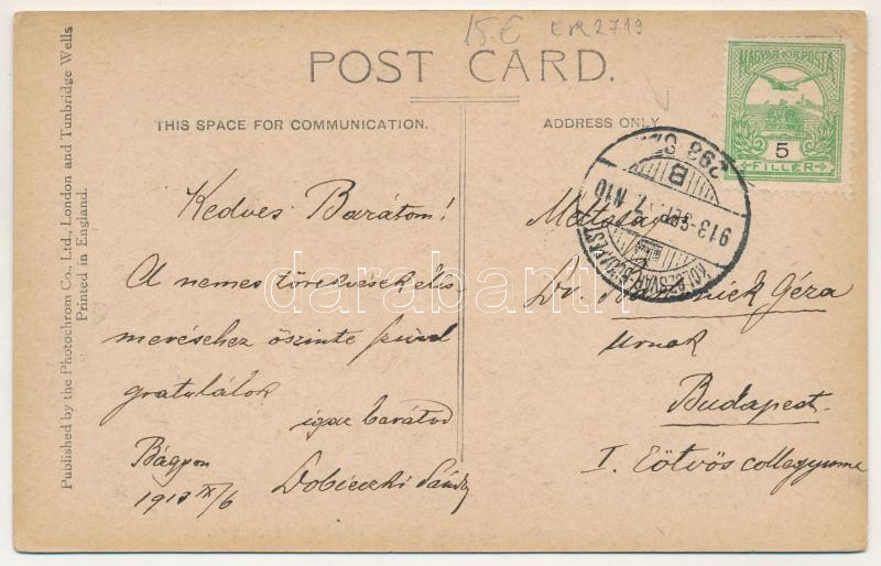 1913 Bágyon, Badeni (Torda); Dobieczky nyaraló, villa, a tulajdonos Dobieczki Sándor levelével, címzett Dr. Bartoniek Géza, az Eötvös Collegium első igazgatója 1854?1930. / villa, with the letter of the owner + "KOLOZSVÁR - BUDAPEST 298. SZ." vasúti mozgóposta bélyegző (EK)