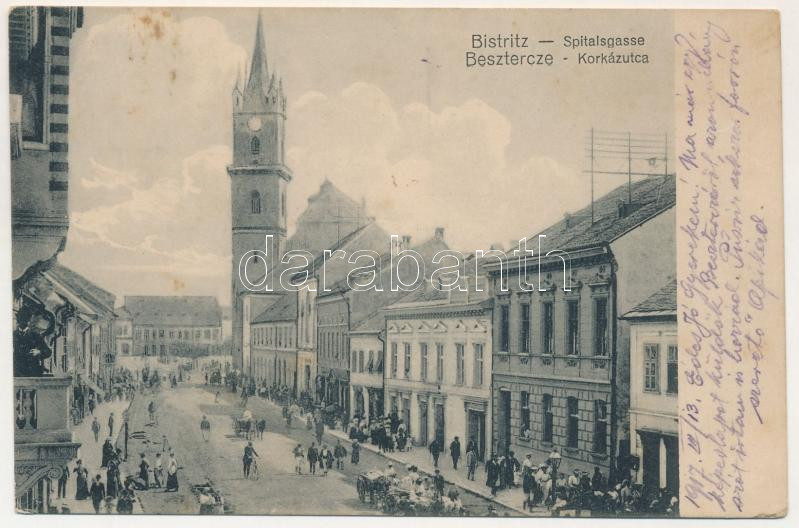 Beszterce, Bistritz, Bistrita; Spitalsgasse / Kórház utca, templom, piac, üzletek. F. Stolzenberg kiadása / street view, church, market, shops + "M. kir. 51. honvéd tábori tarackos ezred 2. lőszer oszlop" (fl)