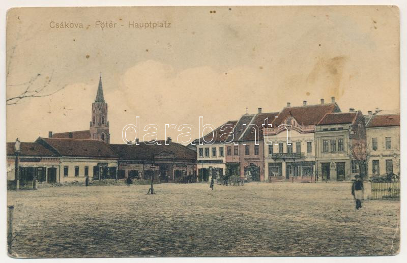 Csák, Csákova, Ciacova; Fő tér, üzletek. Deutsch József kiadása / main square, shops (szakadás / tear)
