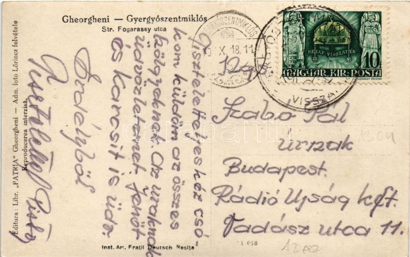 Gyergyószentmiklós, Gheorgheni; Fogarassy utca / street view + "1940 Gyergyószentmiklós visszatért" So. Stpl.