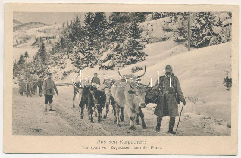 Kárpátok, Karpaten, Carpathian mountains; Transport von Zugochsen nach der Front. Dr. Trenkle & Co. / Igásökrök szállítása a frontra / Transport of draft oxen to the front in winter (EB)