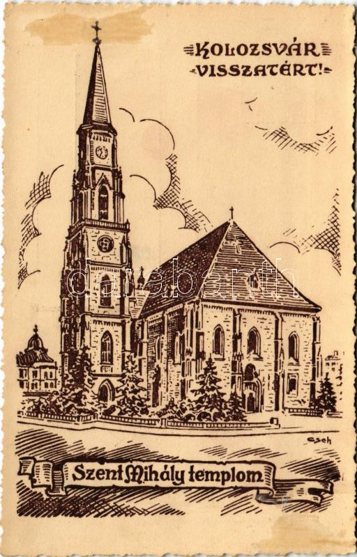 Kolozsvár, Cluj; Szent Mihály templom. "Kolozsvár visszatért!" / church, entry of the Hungarian troops s: Cseh (ragasztónyom / glue marks)