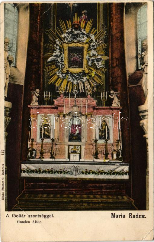 Máriaradna, Mária-Radna, Radna (Lippa, Lipova); kegytemplom, főoltár a szentséggel. Fischer G. kiadása / pilgrimage church, interior with main altar (fa)