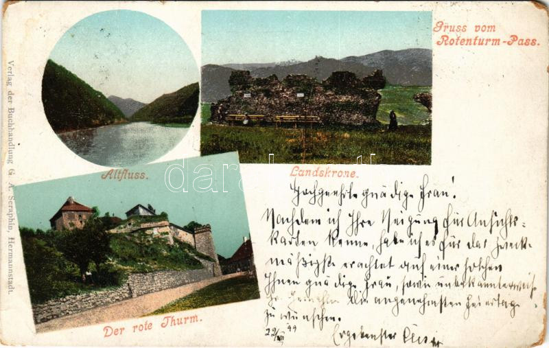 Vöröstoronyi-szoros, Rotenturm-Pass, Pasul Turnu Rosu; Altfluss, Landskrone, Der Rote Turm / Olt folyó, várrom, Vöröstorony. G.A. Seraphin kiadása / river, castle, ruins (EB)