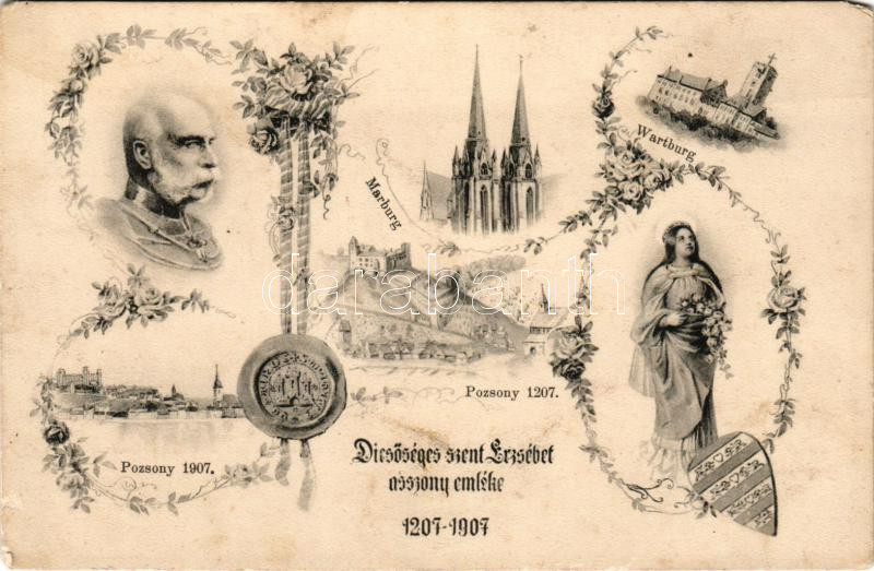 1207-1907 Pozsony, Pressburg, Bratislava; Wartburg, Marburg, Ferenc József. Dicsőséges Szent Erzsébet asszony emlékére. Szent Erzsébet Jubileumi Bizottság kiadása / Franz Joseph, 700th anniversary of the birth of Saint Elizabeth of Hungary. Art Nouveau, floral (EM)