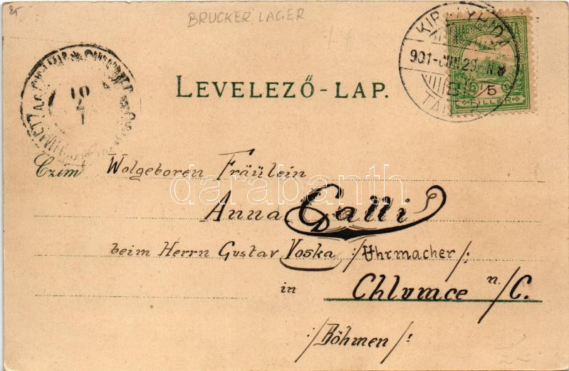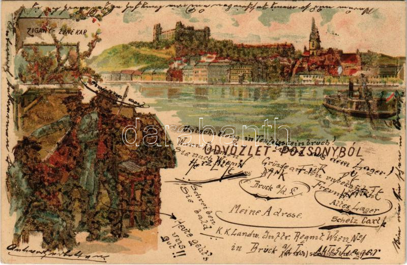 1901 Pozsony, Pressburg, Bratislava; vár, gőzhajó, cigány zenekar / castle, steamship, Gypsy musicians, folklore. Art Nouveau, litho