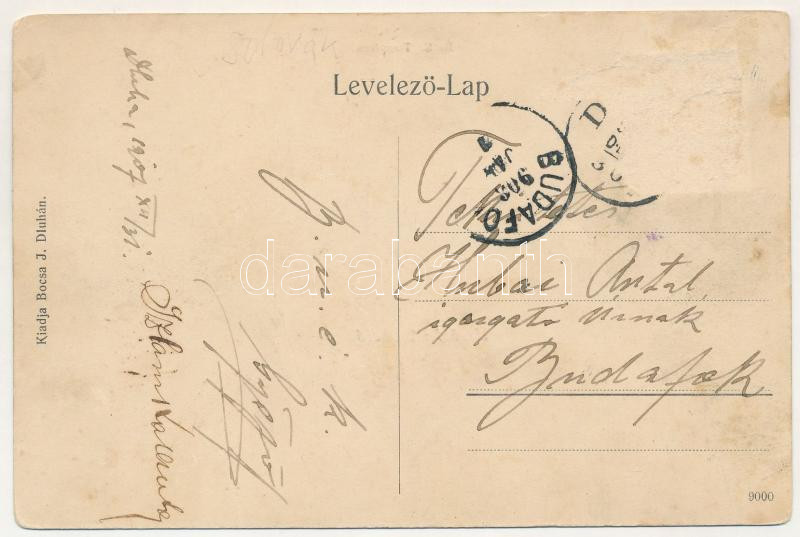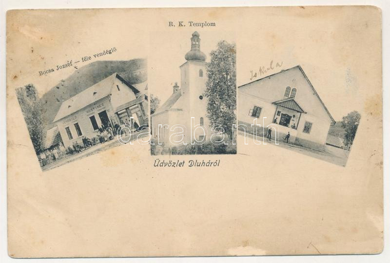 1908 Dluha, Bánhegy, Dlhá nad Oravou; Római katolikus templom, iskola, Bocsa József-féle vendéglő. Bocsa J. saját kiadása / Catholic church, school, restaurant, inn (Rb)