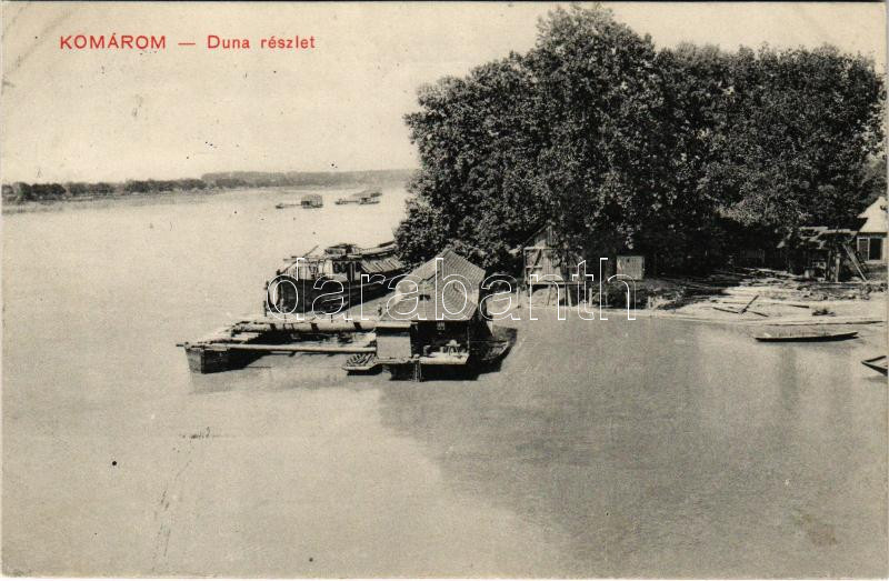 1910 Komárom, Komárno; Duna részlet, kikötő, hajómalom csoport a távolban. L.H.K. / Danube riverside, port, boat mills in the distance (fl)