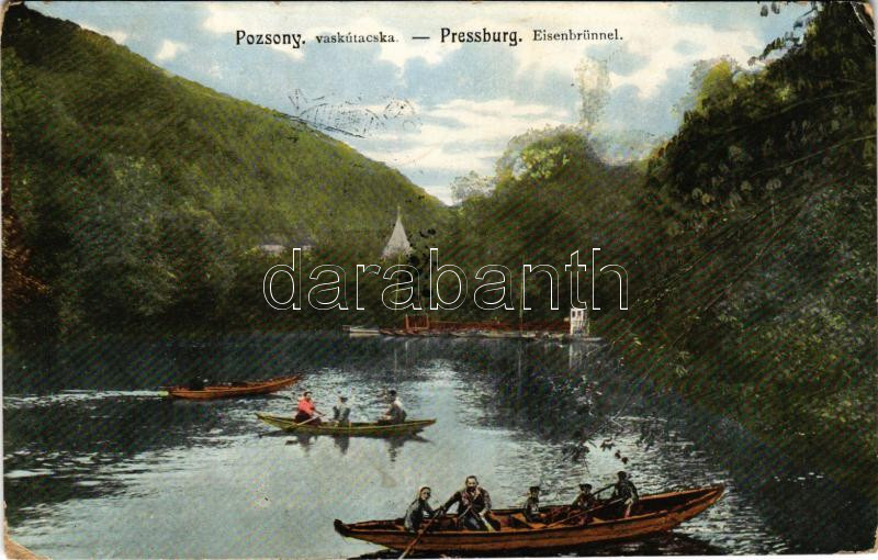 1912 Pozsony, Pressburg, Bratislava; Vaskutacska, csónakázók. Kaufmann kiadása / Eisenbrünnel (Eisenbründl) / Zelezná Studienka / spa, lake with rowing boats (EK)