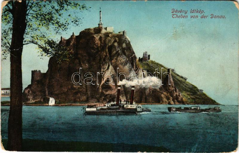 1913 Dévény, Theben a. d. Donau, Devín (Pozsony, Bratislava); Dévényi vár, gőzhajó / Hrad Devín / castle ruins, steamship (EM)