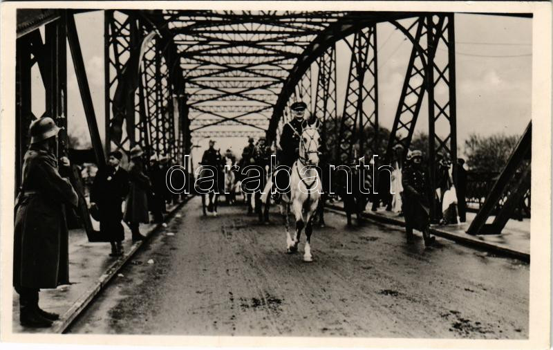 1938 Komárom, Komárno; bevonulás, Vitéz Nagybányai Horthy Miklós Magyarország kormányzója fehér lovon a hídon / entry of the Hungarian troops, Regent Horthy