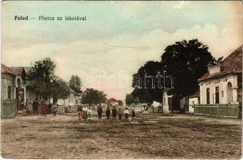 Feled, Feledince, Veladín, Jesenské; Fő utca az iskolával. Vasúti levelezőlapárusítás 4328. / main street, school (gyűrődések / creases)