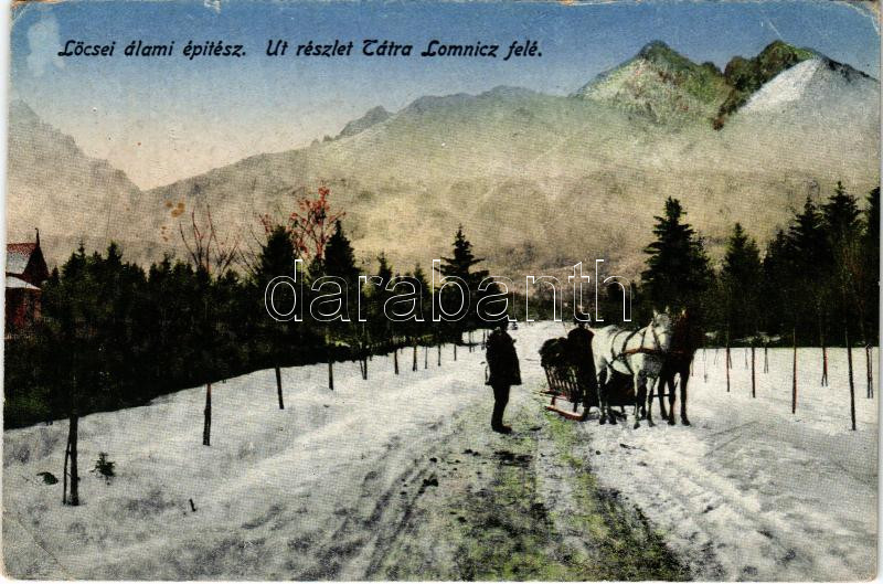 Tátra, Vysoké Tatry; Út Tátralomnic felé télen, lovasszán. Lőcsei állami építész. Vasúti levelezőlapárusítás / road to Tatranska Lomnica in winter, horse sleigh (EM)