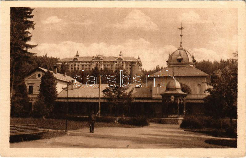 Tátralomnic, Tatranská Lomnica (Magas-Tátra, Vysoké Tatry); Kúpele, v pozadí Grandhotel Praha / Praha nagyszálloda és fürdő / spa hotel and bathhouse (gyűrődés / crease)