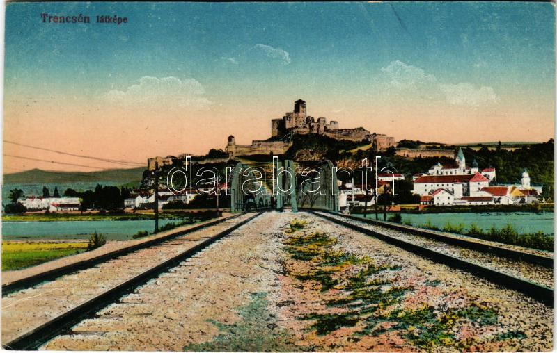 Trencsén, Trencín; látkép, vár, híd. Vasúti levelezőlapárusítás 28. sz. - 1917. / general view, castle, bridge (gyűrődés / crease)