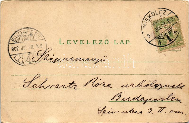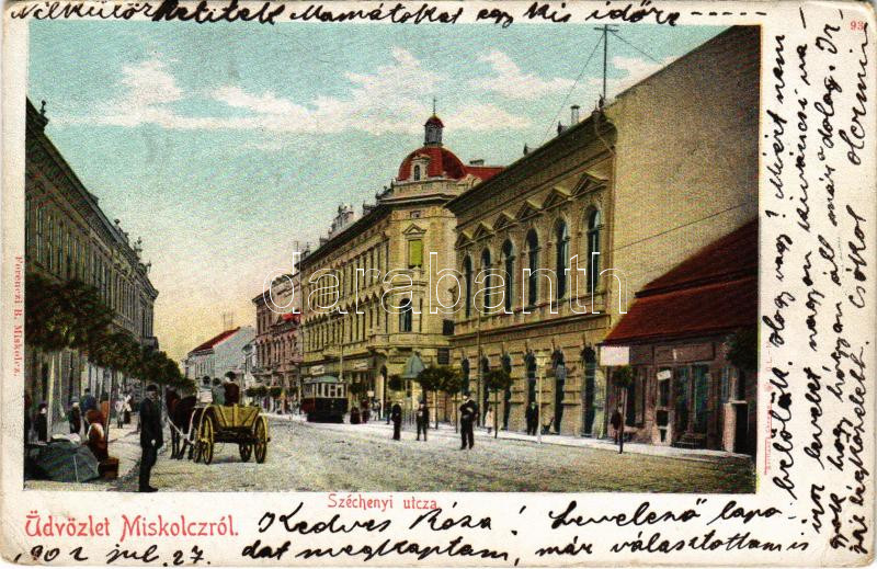 1902 Miskolc, Széchenyi utca, villamos, üzletek. Ferenczi B. kiadása (EB)