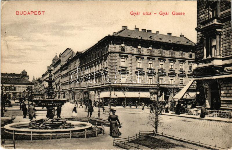 1913 Budapest VI. Gyár utca (Jókai tér - Andrássy út sarka), Grünhut József üzlete, Budapesti Terézvárosi Takarékpénztár, Palermo kávéház, szökőkút (vágott / cut)