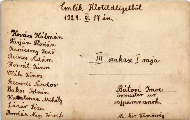 1929 Klotildliget (Piliscsaba), Vámőrök csoportképe, III. szakasz I. raj, Bátori Imre rajparancsnok, hátoldalon névsor. photo
