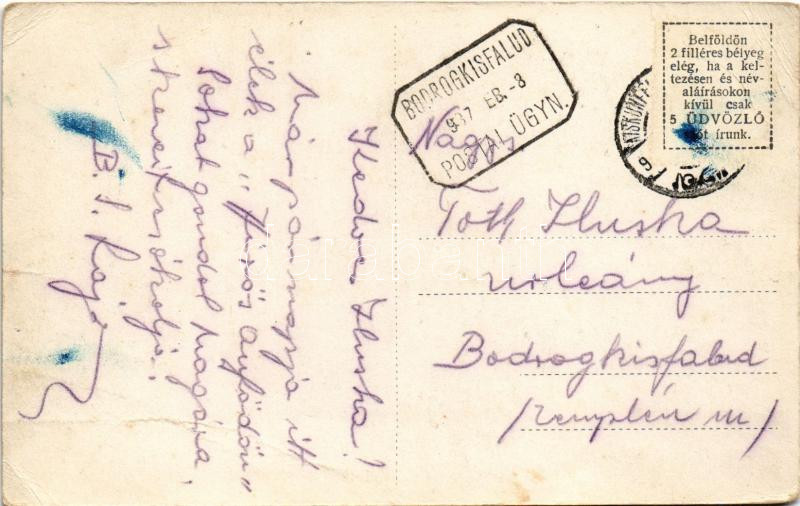 1937 Kiskunfélegyháza, Petőfi-ház, Római katolikus ótemplom és új templom, látkép + "BODROGKISFALUD POSTAI ÜGYN." (EB)