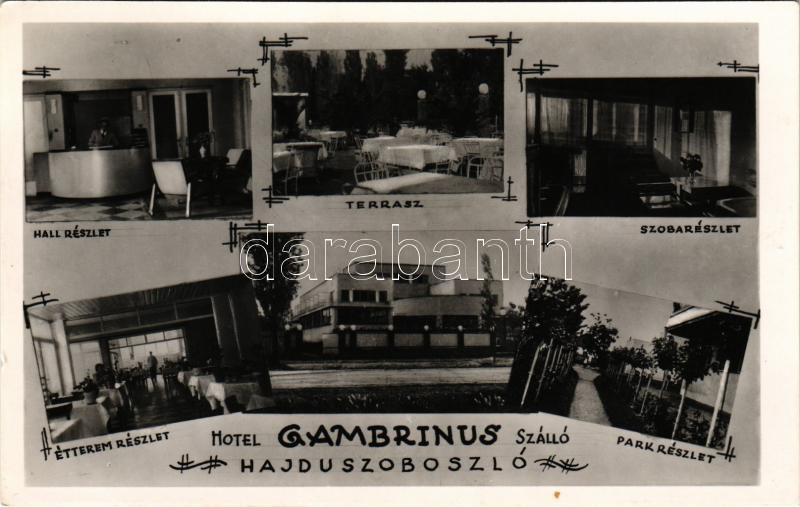1949 Hajdúszoboszló, Hotel Gambrinus szálloda és étterem, hall részlet, terasz, szoba részlet, belsők, park