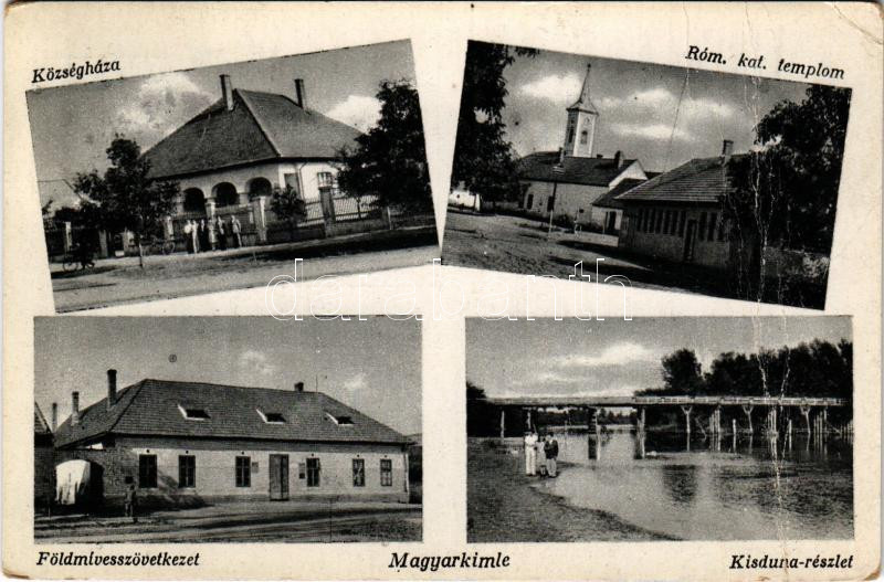 1954 Magyarkimle (Kimle), Községháza, római katolikus templom, Földmívesszövetkezet, Kisduna-részlet, híd. Özv. Horváth Richárdné kiadása (fa)