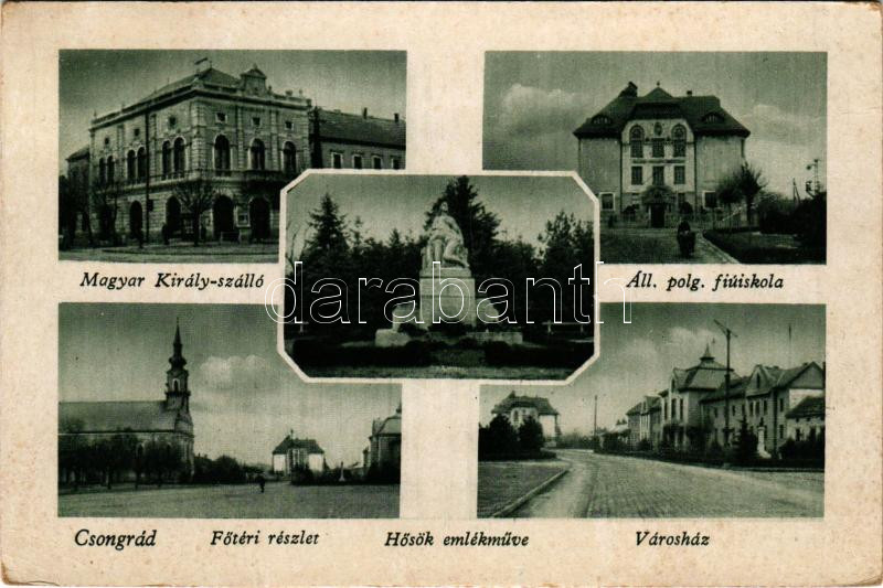 Csongrád, Magyar Király szálloda, Állami polgári fiúiskola, Főtéri részlet, Hősök emlékműve, Városháza (A kiadó neve utólag lekaparva!) (Rb)
