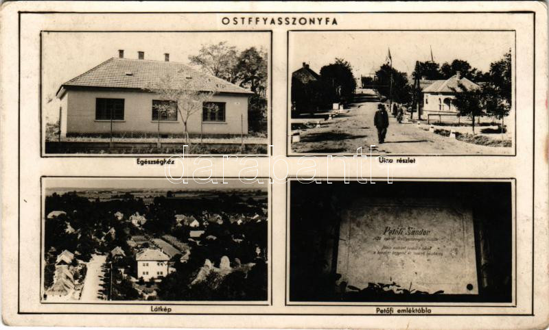 Ostffyasszonyfa, Egészségház, utca részlet, látkép, Petőfi emléktábla. Hangya szövetkezet kiadása (EK)