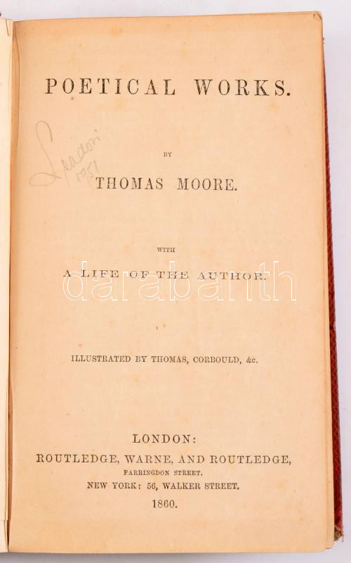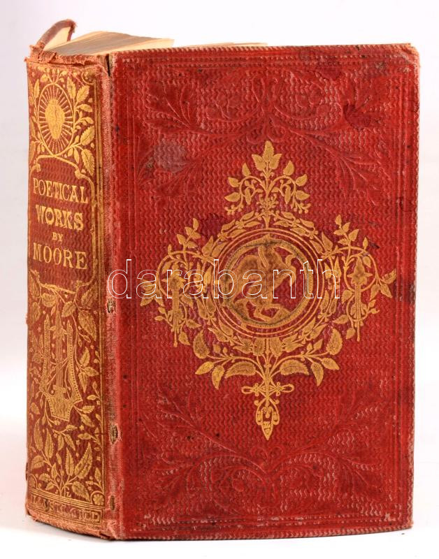 Moore, Thomas: Poetical Works. With a Life of the Author. London-New York, 1860, Routledge, Warne and Routledge, XXVII+[1]+528+4 p. Angol nyelven. Aranyozott egészvászon-kötésben, kissé viseltes borítóval. / In English langauge. Hardcover, with slightly worn cover.