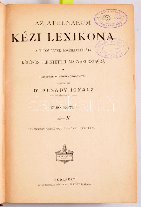 Acsády Ignác (szerk.): Az Athenaeum kézi lexikona. A tudományok encziklopédiája, különös tekintettel Magyarországra. I-II. köt. [Teljes.] Bp., [1892-1893], Athenaeum, VIII+999+[1] p.; VIII p.+ 1001-1904 p. Oldalszámozáson kívül számos fekete-fehér és színes képtáblával, térképekkel. Kiadói aranyozott gerincű félbőr-kötés, viseltes, sérült gerinccel, a II. kötetben több kijáró lappal.