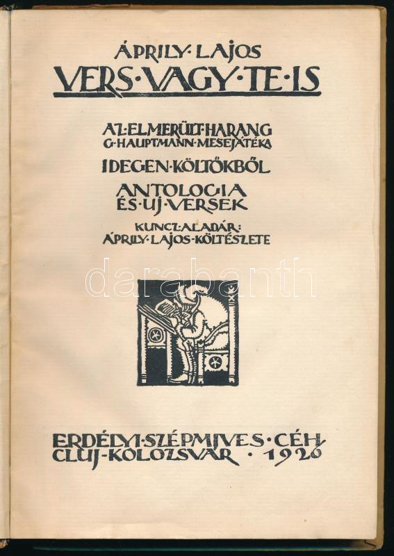 Áprily Lajos: Vers vagy te is. Cluj-Kolozsvár, 1920, Erdélyi Szépmíves Céh. 156p. 1. kiadás. Kós Károly illusztrációjával. Kiadói kartonált kötés, gerinc sérült kopottas állapotban.