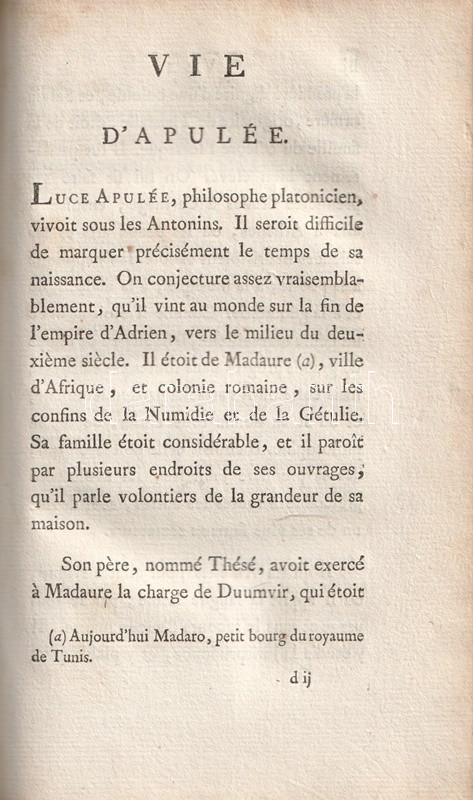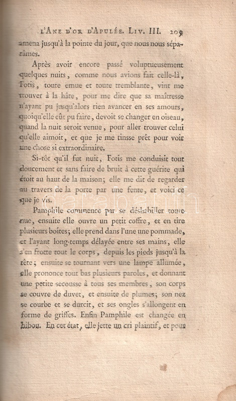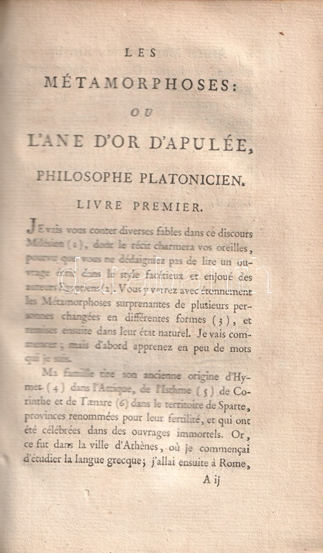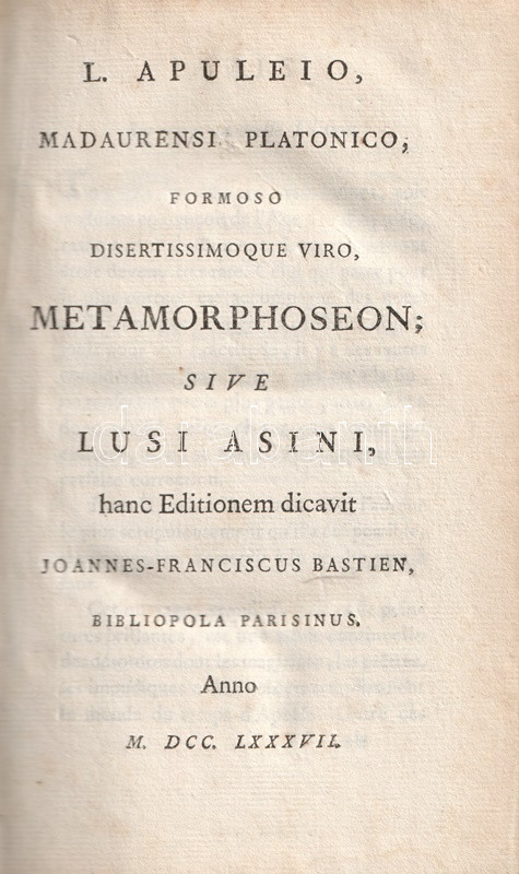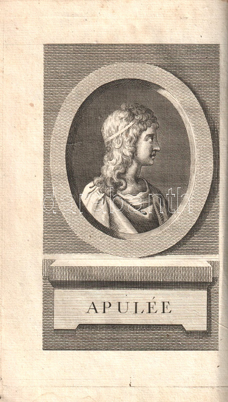 Apulieus (124-170 után) afrikai származású antik szerző kalandregénye, a "Metamorphosoes, sive asino aureo libri undecim" (Aranyszamár) az ókor egyetlen maradéktalanul fennmaradt szórakoztató regénye, hatása a reneszánsz kultúrára felmérhetetlen. Olasz közvetítéssel jutott el Franciaországba, korai francia fordításai a 17. századtól ismeretesek. Kétnyelvű, latin-francia Aranyszamár-kiadásunk humanista pontossággal javított és kommentált mű. A mű két kötetben teljes, példányunk a mű első hat fejezetét tartalmazza.