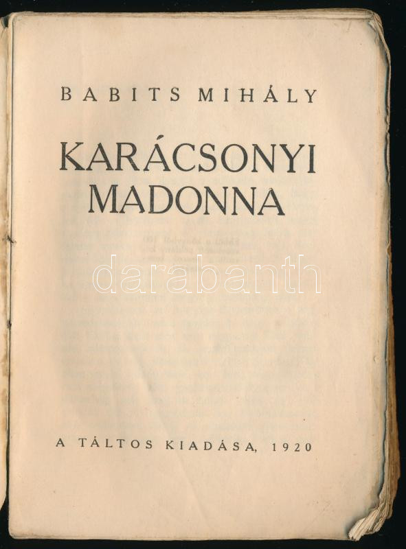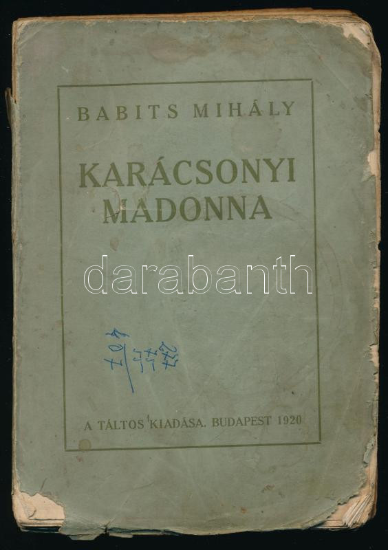 Babits Mihály: Karácsonyi Madonna. Bp., 1920, Táltos, 246+[2] p. Első kiadás. Kiadói papírkötés, viseltes állapotban, koszos, sérült borítóval és gerinccel, részben szétváló fűzéssel, helyenként kissé foltos lapokkal.