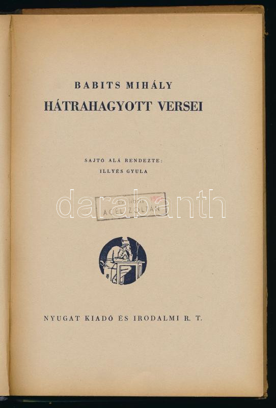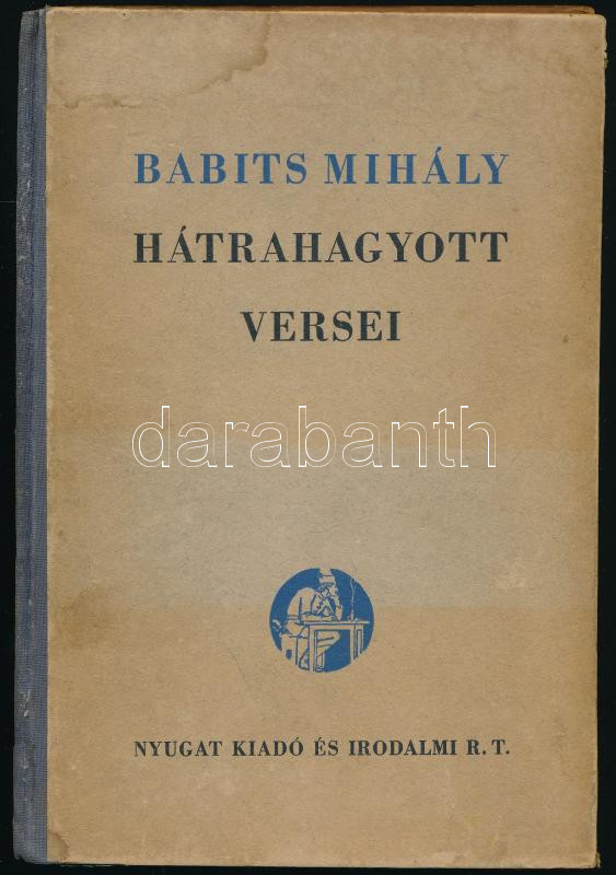 Babits Mihály hátrahagyott versei. Sajtó alá rendezte: Illyés Gyula. [Bp., 1941], Nyugat, 54+[2] p. Egyetlen kiadás. Kiadói félvászon-kötés, kissé foltos borítóval és gerinccel, tulajdonosi bélyegzővel. Számozott (1665./2000) példány.