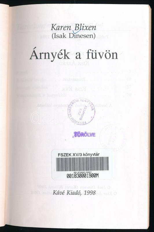 Blixen, Karen: Árnyék a füvön. 1998, Kávé Kiadó. Kiadói papírkötés, műanyag védőborítóval, jó állapotban.