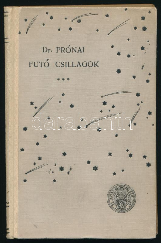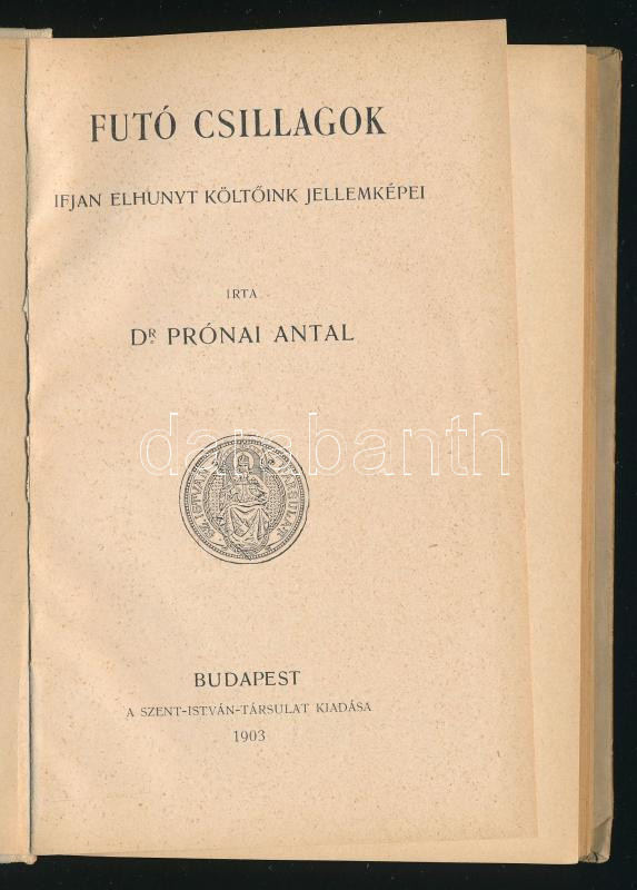 Dr. Prónai Antal: Futó csillagok. Ifjan elhunyt költőink jellemképei. Bp., 1903, Szt.-István-Társulat. 146p. Félvászon kötés, kissé kopottas állapotban.