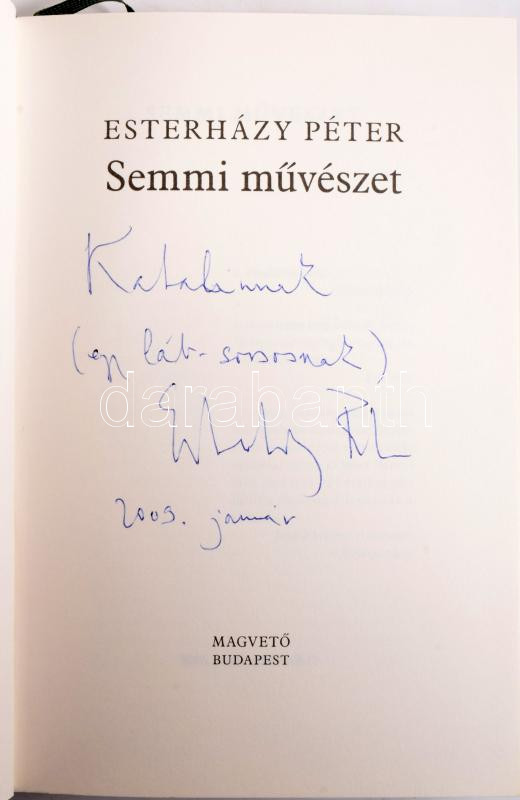 Esterházy Péter: Semmi művészet. A szerző, Esterházy Péter (1950-2016) Kossuth- és József Attila-díjas író, publicista által dedikált példány! Bp., 2008, Magvető, 224+[6] p. Kiadói egészvászon-kötés, kiadói papír védőborítóban.