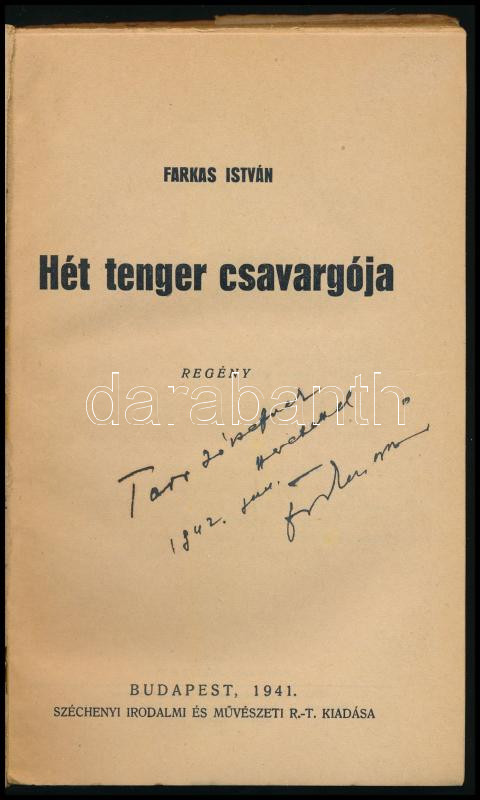 Farkas István: Hét tenger csavargója. DEDIKÁLT! Bp., 1941, Széchenyi Irodalmi és Művészeti Rt. Kiadói papírkötés, papír védőborítóval, kopottas állapotban.