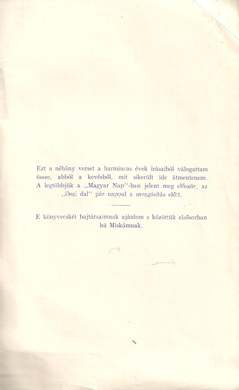 A kötet fülszövege: "Ezt a néhány verset a harmincas évek írásaiból válogattam össze, abból a kevésből, amit sikerült ide átmentenem. A legtöbbjük a Magyar Nap-ban jelent meg először, az Őszi dal pár nappal a mozgósítás előtt. E könyvecskét bajtársaimnak ajánlom, s közöttük elsősorban hű Miskámnak".