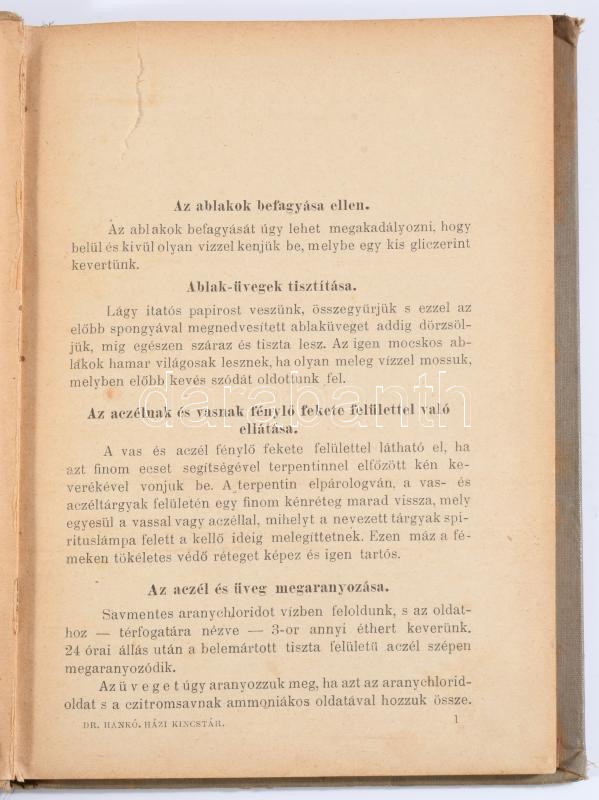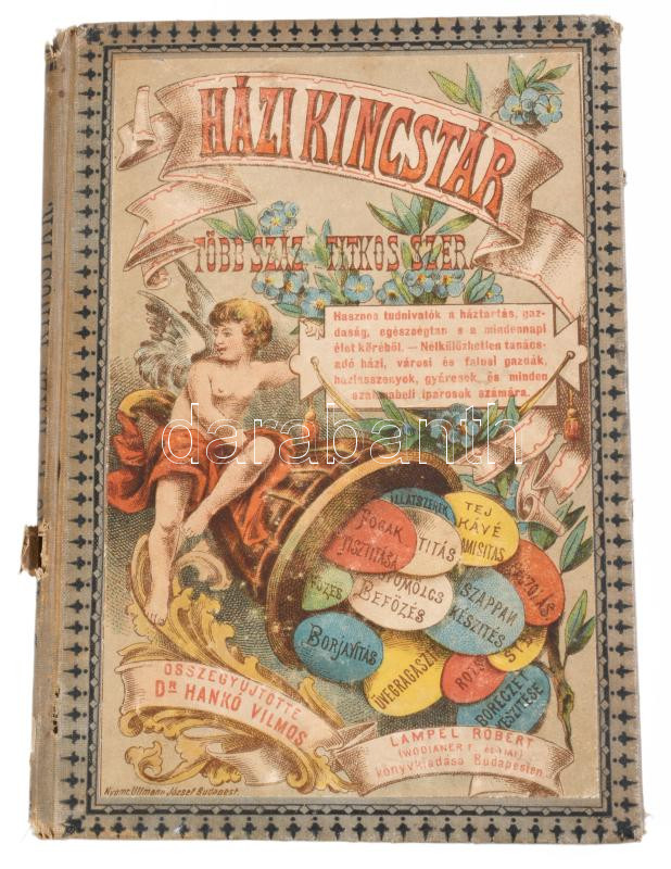 Hankó Vilmos: Házi kincstár. Több száz titkos szer, hasznos tudnivalók a háztartás, gazdaság, egészségtan s a mindennapi élet stb. köréből. Összegyűjtötte: - -. Bp., 1888, Lampel Róbert, 2+130+1 p. Kiadói illusztrált egészvászon-kötés, kopott borítóval, sérült gerinccel és 12 oldalig szakadt lapokkal.