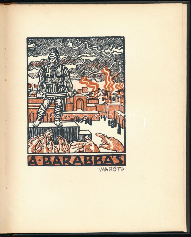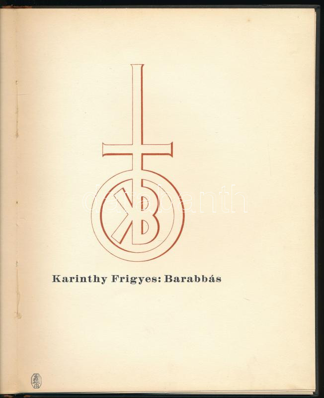 Karinthy Frigyes: Barabbás. Hungária Könyvek 1. (Bp., 1935, Hungária), 18+(6) p. Első kiadás. Oldalszámozáson belül Maróti Géza két egészoldalas fametszetével. Kiadói félvászon kötés, belül a gerincnél részben szétvált.