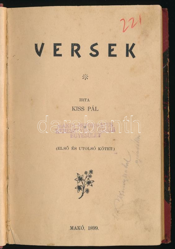 Kiss Pál: Versek. Makó, 1899, (Gaál László-ny.), 117 p. Egyetlen kiadás. Átkötött félvászon-kötésben, kissé viseltes borítóval, helyenként kissé foltos lapokkal, bélyegzőkkel.