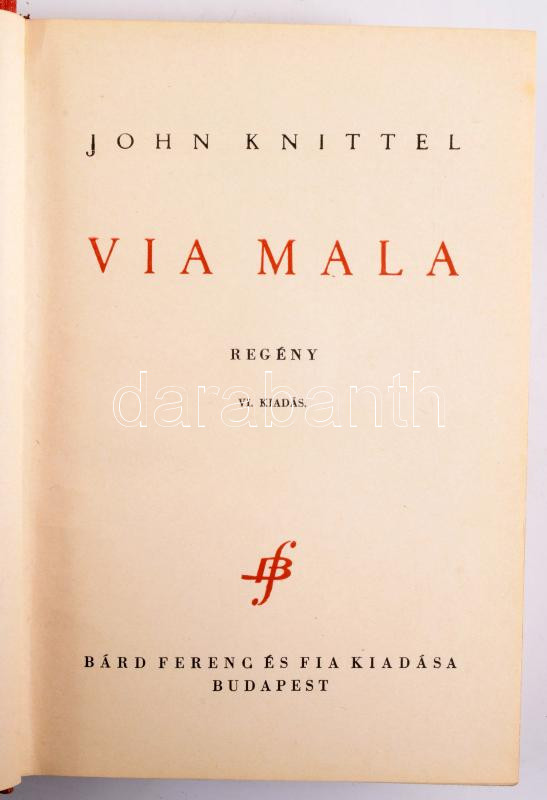 Knittel, John: Via Mala. Regény. Szép írások 4. köt. Bp., [1942], Bárd Ferenc és Fia, 648 p. Kiadói egészvászon-kötés, kissé sérült kiadói papír védőborítóban.