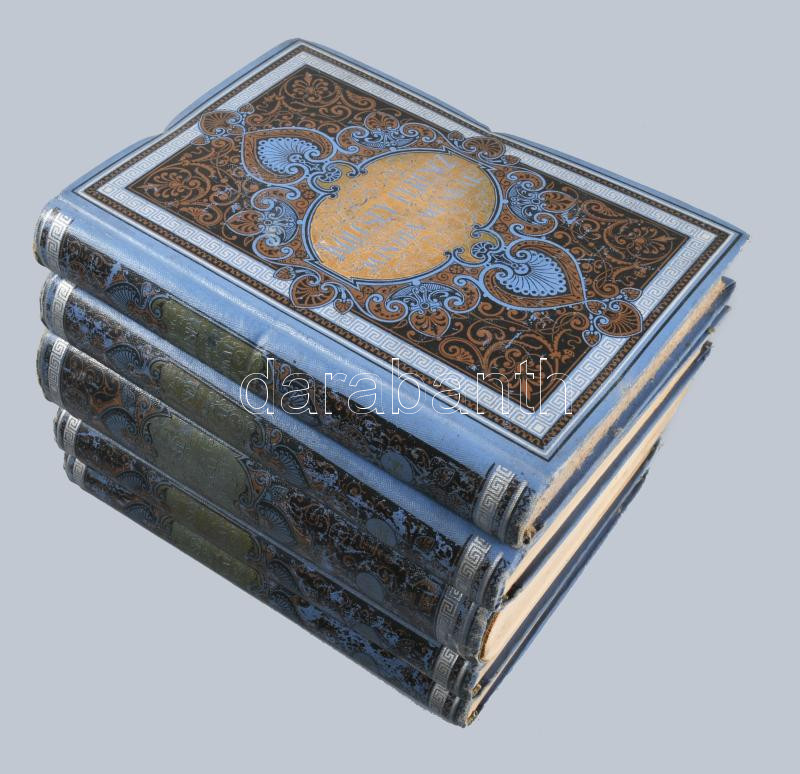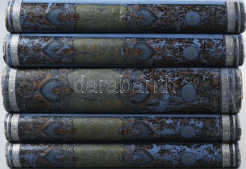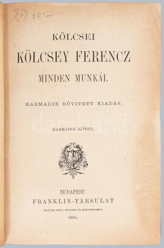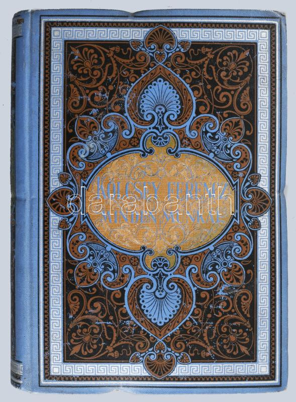 Kölcsey Ferencz minden munkái. Harmadik, bővített kiadás. 3-10. köt. (5 kötetbe kötve) Bp. 1886-1887. Franklin. Egységes, dúsan aranyozott, festett kiadói egészvászon díszkötésben. A 7-8. kötet kötéstáblája elvált a borítótól, az összes többi kötet szép állapotban