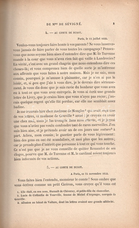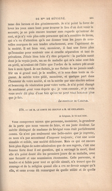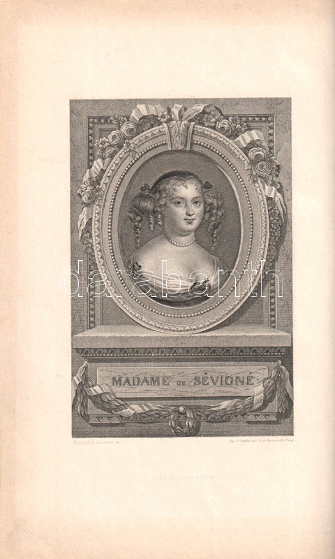 Madame de Sévigné (1626-1696), a XVII. század kiemelkedően művelt, több nyelvet beszélő úrnője eleinte az irodalmi szalonok ünnepelt tagja volt, később, új férje oldalán Provence-ba költözött, és levelek útján tartotta kapcsolatát párizsi ismerőseivel. A magas körökben forgó szerző csevegő leveleiből jó rálátás nyílik a XVII. századi udvari életmód részleteire, a politikai hírekre és pletykákra, a vidéki közigazgatás kihívásaira egyaránt. Levelei egy részét már 1697-től kiadták, a teljes, 1500-nál is több levelet számláló életművet a maga teljességében csak a XIX. század közepétől publikálták. Népszerű kiadásunk, melyhez Charles Nodier francia író írt előszót, az életműből 279 levelet közölt és először 1855-ben jelent meg; a kiadó a Nodier-féle válogatást évtizedeken keresztül piacon tartotta.